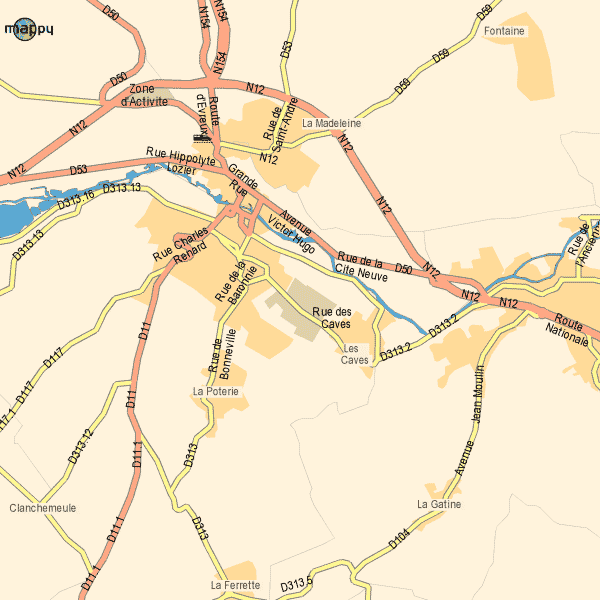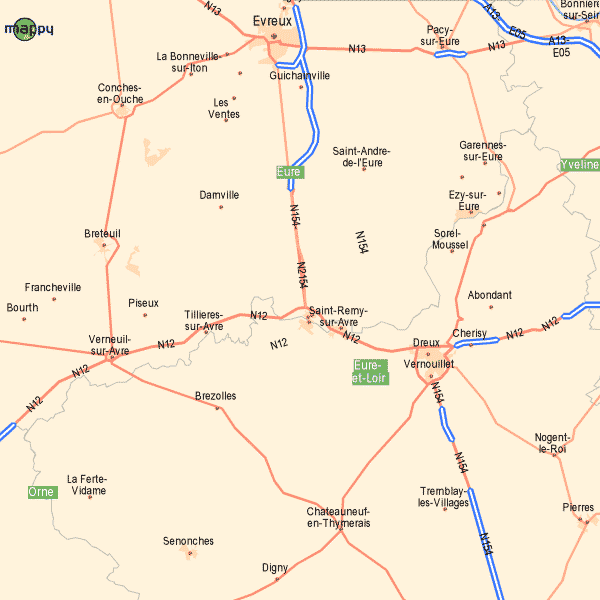 Nach dem Kreisverkehr (Kreuzung RN154/RN12) links abbiegen, Richtung Dreux folgen, nach dem nächsten Kreisverkehr (Leclerc-Tankstelle rechts) bis zur ersten Ampel fahren, dann die erste Ausfahrt rechts nehmen und für 1 km weiterfahren.